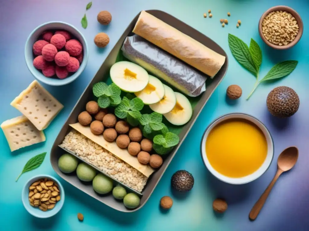 Una detallada ilustración en acuarela de snacks saludables con maca peruana, con colores vibrantes y detalles intrincados resaltando la textura e ingredientes de cada delicia