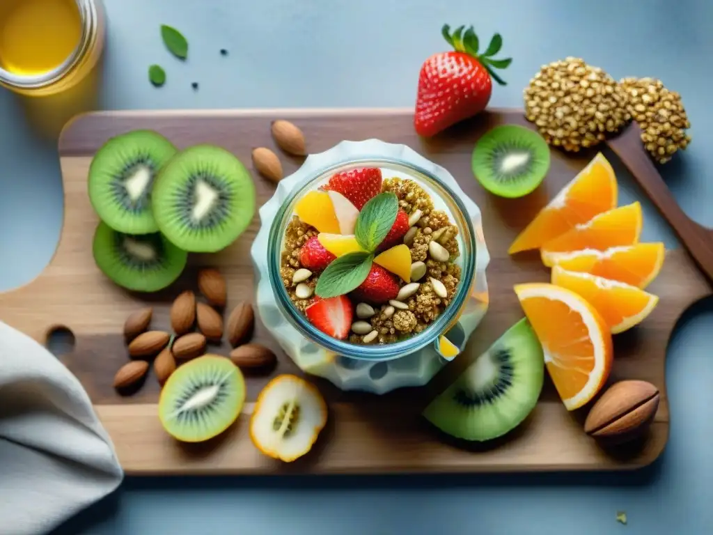 Un festín de snacks saludables para mejorar energía: frutas frescas, frutos secos, semillas y yogur griego con granola