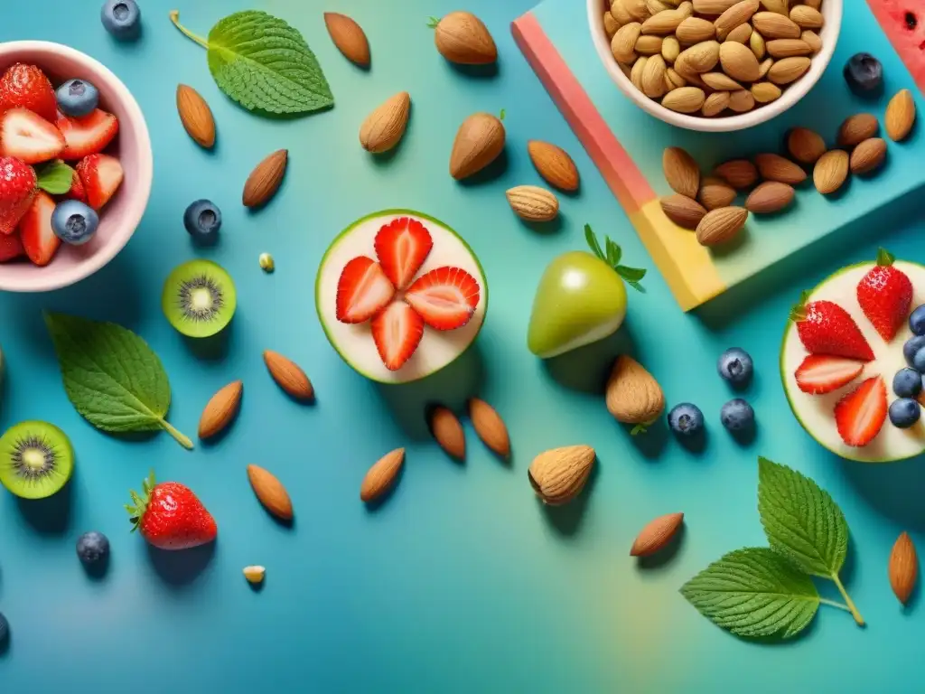 Una exquisita pintura acuarela de snacks saludables con tecnología: frutas frescas y frutos secos detallados y tentadores en un fondo de tonos pastel