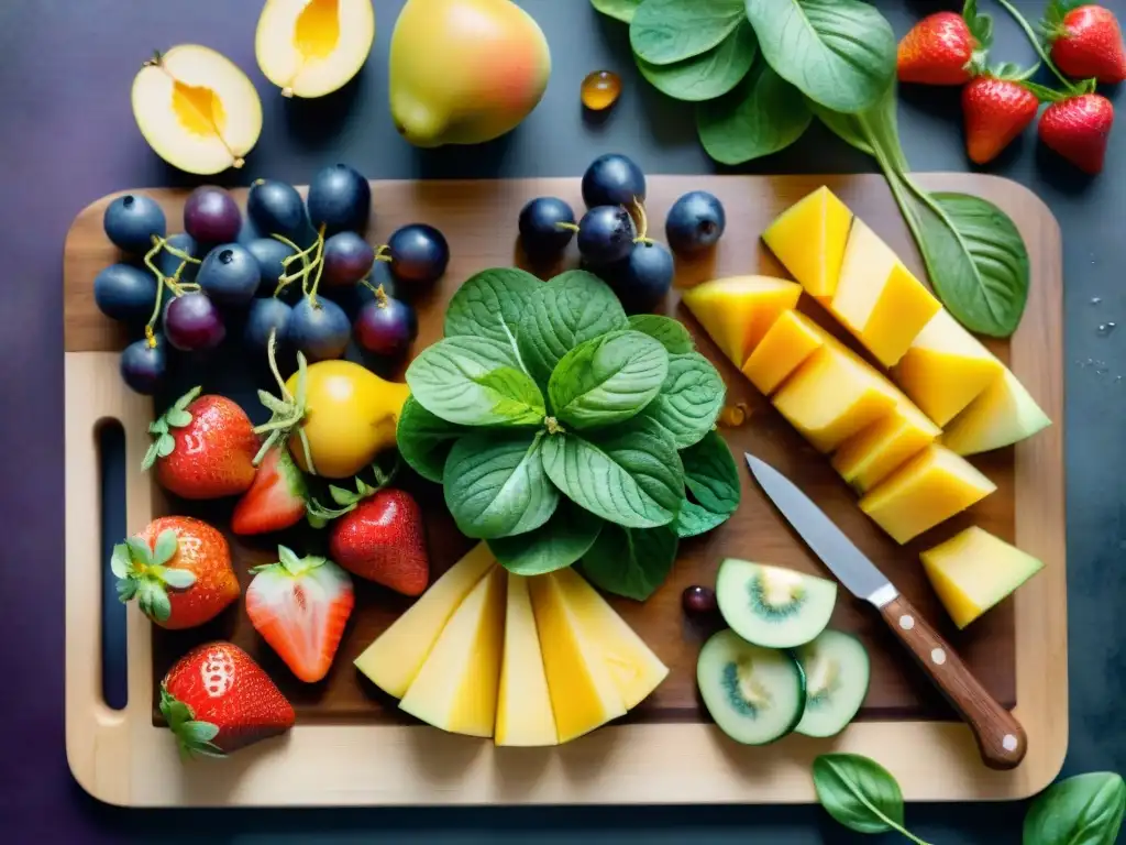 Tabla de snacks saludables con frutas, frutos secos, yogurt y smoothie verde
