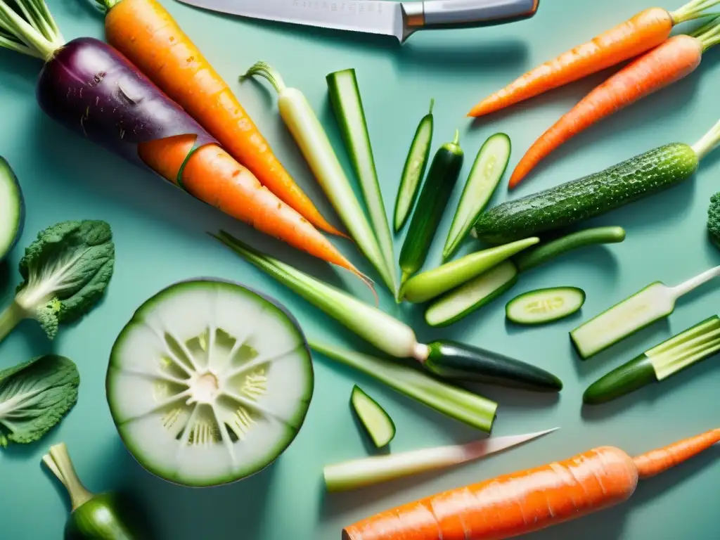 Vegetales coloridos pelados con precisión por un moderno pelador, resaltando la importancia de los mejores peladores de vegetales saludables