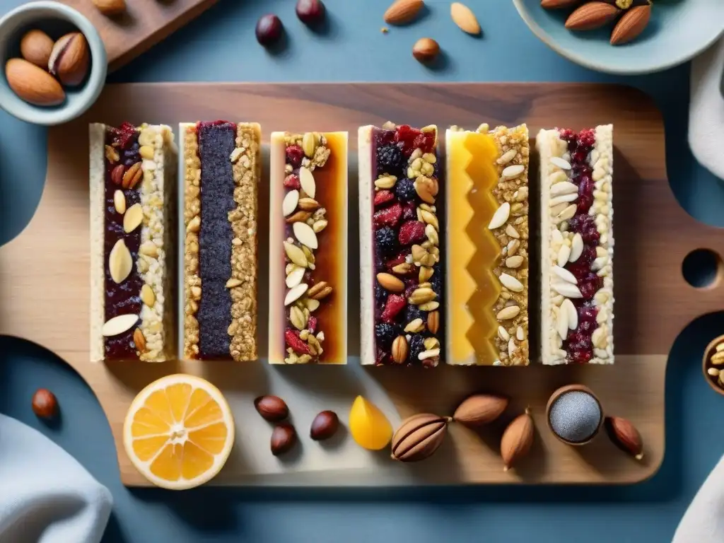 Deliciosas barritas energéticas caseras para niños, decoradas con frutos secos y semillas en una tabla de madera
