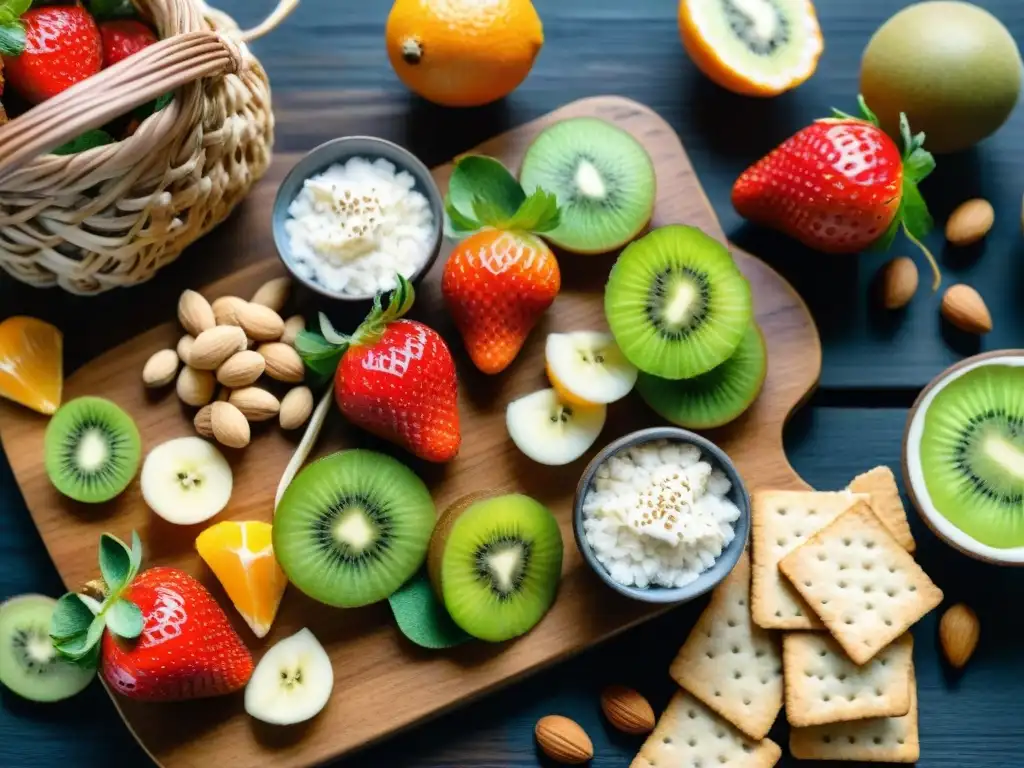 Deliciosos snacks saludables recomendados por expertos en nutrición, con frutas, verduras, frutos secos y semillas coloridos en una tabla de madera