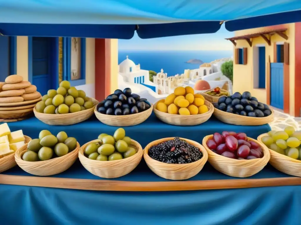 Pintura detallada de un animado mercado mediterráneo con snacks saludables con influencia griega