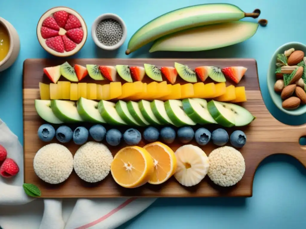 Un festín saludable y colorido para niños: brochetas de fruta, arroz con aguacate, palitos de zanahoria con hummus y barras de granola sin gluten